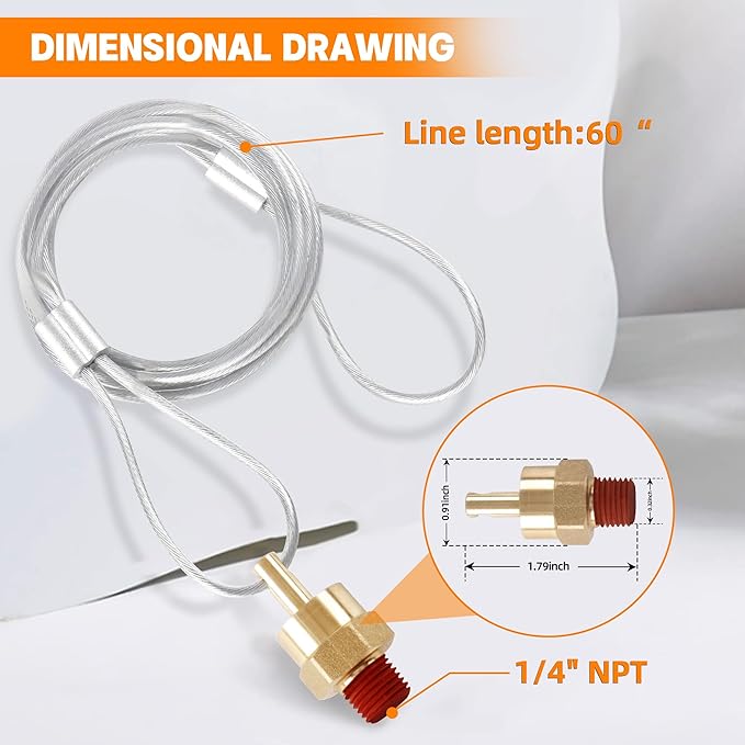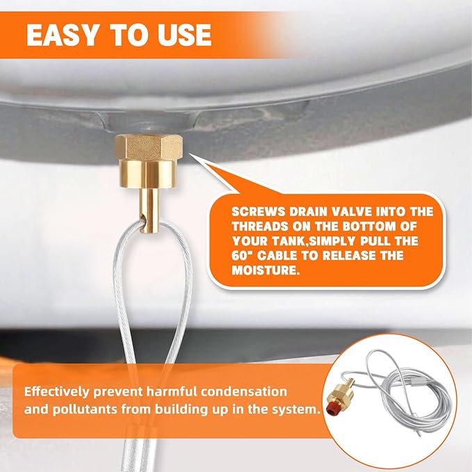- Easy to Use: The air compressor drain valve plug fitting screws into the threads on the bottom of the tank and drains moisture by pulling on the 60 inch steel cable